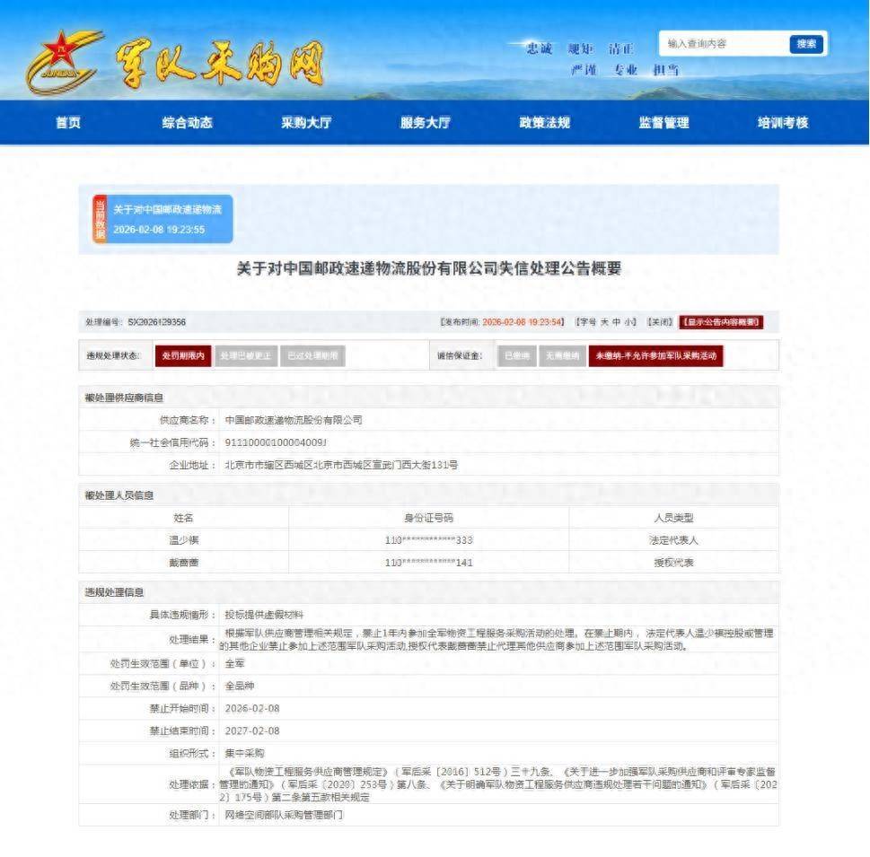 《对于对中国邮政速递物流股份有限公司失信处理公告》(处理编号:SX2026129356)清晰,经探听核实,中国邮政速递物流股份有限公司在插足时势编号:2025-JC01-W1076(04)采购行为中,存在投标提供诞妄材料等违法步履。证实队伍供应商贬责干系限定,自2026年02月08日起,1年不容三军物质工程处事采购行为的处罚。